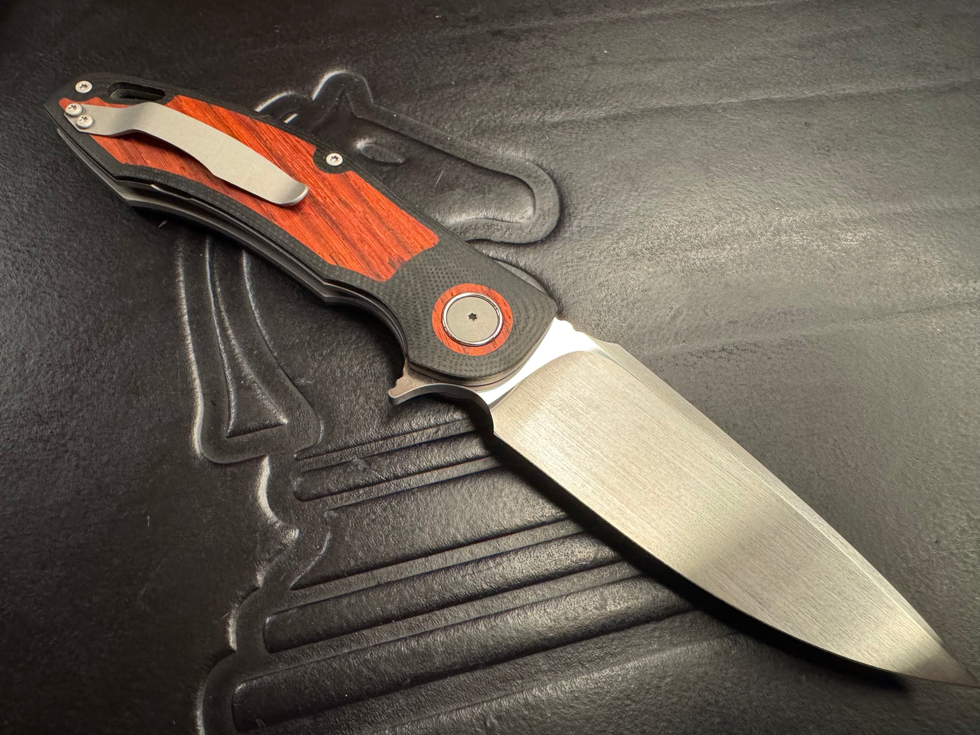 Crafted by Riaan Manser of 3 Leg Dog Knives, the Model H4 Standard combines precision engineering with distinctive aesthetics. The drop point blade features RWL 34 steel hardened to 62 HRC, delivering exceptional edge retention and durability. Rausch ceramic bearings enable smooth, reliable flipper deployment. The black G10 handle with contrasting Padauk Wood inlay provides ergonomic control and visual appeal. This knife represents the meticulous craftsmanship 3LD is known for.