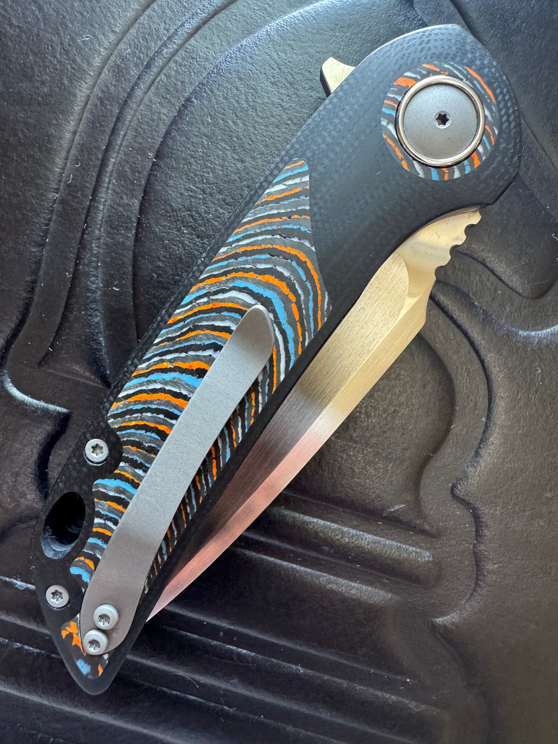 Crafted by Riaan Manser of 3 Leg Dog Knives, the Model W5 Midi combines precision engineering with distinctive aesthetics. The drop point blade features RWL 34 steel hardened to 62 HRC, delivering exceptional edge retention and durability. Rausch ceramic bearings enable smooth, reliable flipper deployment. The black G10 handle with contrasting Gulf Crosscut CamoCarbon inlay provides ergonomic control and visual appeal. This knife represents the meticulous craftsmanship 3LD is known for.