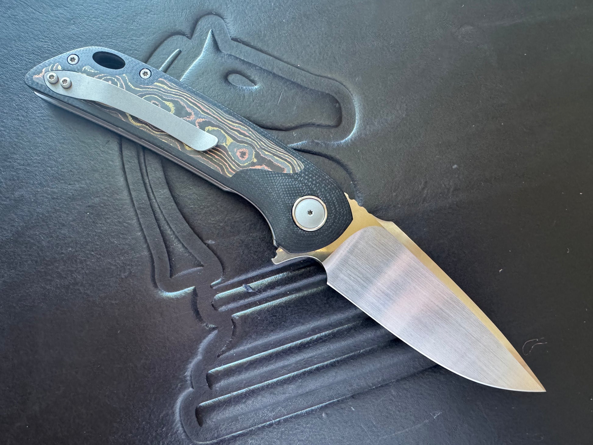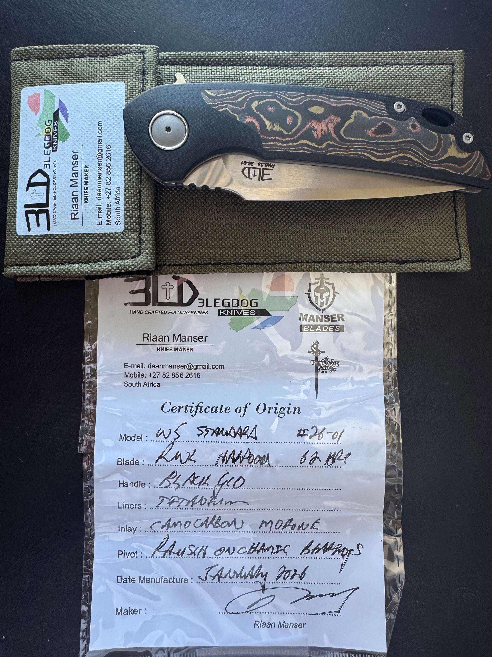 Crafted by Riaan Manser of 3 Leg Dog Knives, the Model W5 Standard combines precision engineering with distinctive aesthetics. The drop point blade features RWL 34 steel hardened to 62 HRC, delivering exceptional edge retention and durability. Rausch ceramic bearings enable smooth, reliable flipper deployment. The black G10 handle with contrasting Mokume CamoCarbon inlay provides ergonomic control and visual appeal. This knife represents the meticulous craftsmanship 3LD is known for.