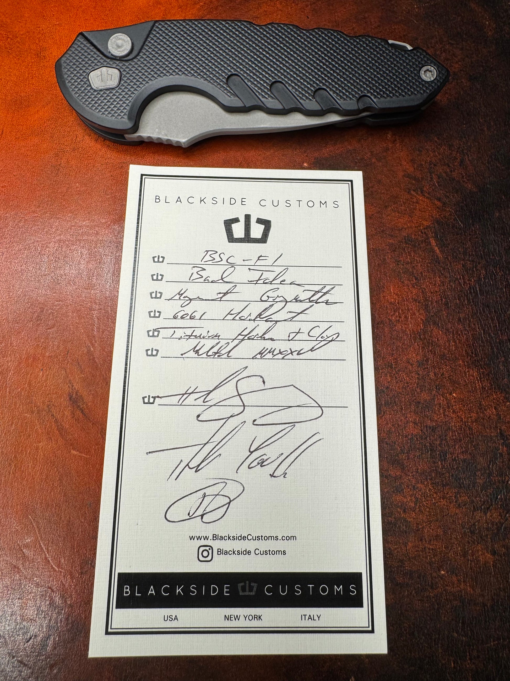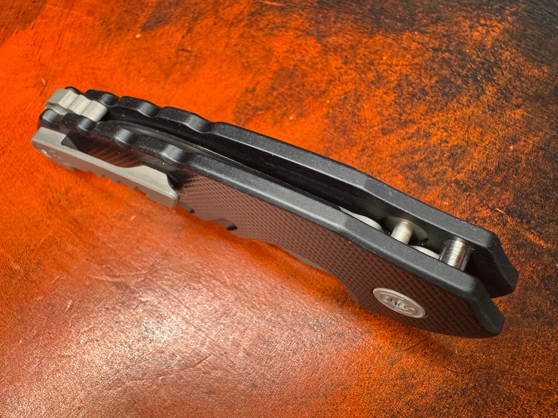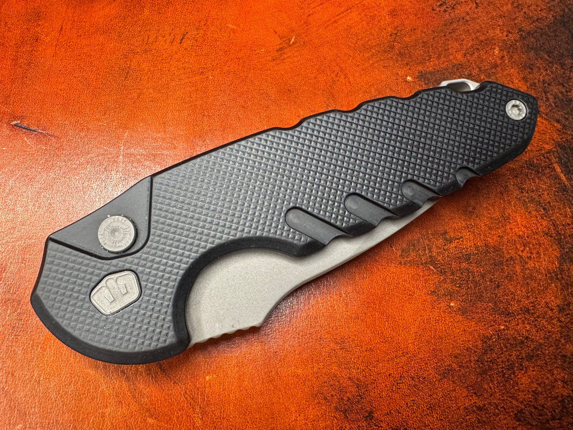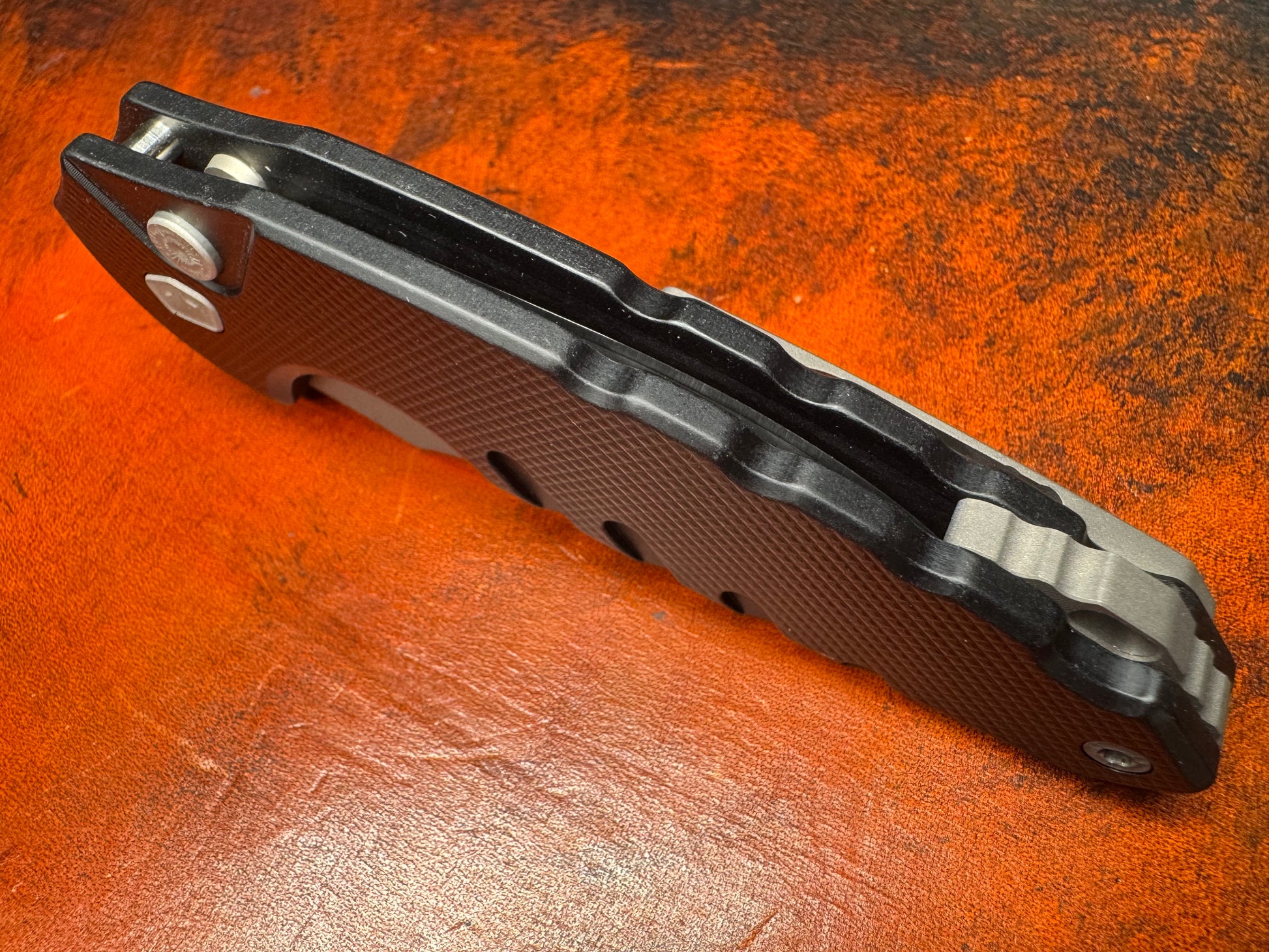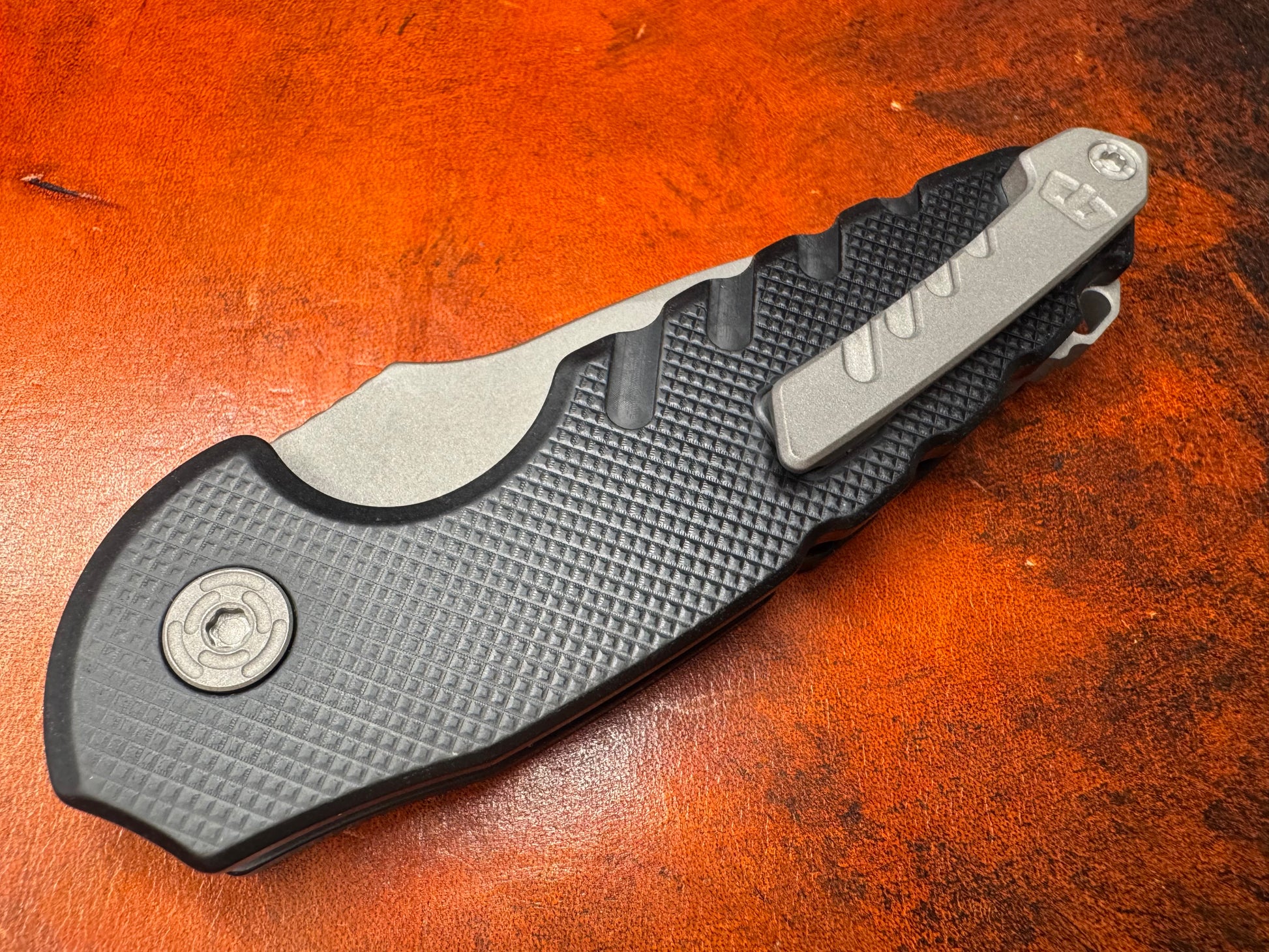 Side Opening Auto with Titanitum handle and pocket clip. This is pre-owned but like new in box. Never been carried and never cut anything.