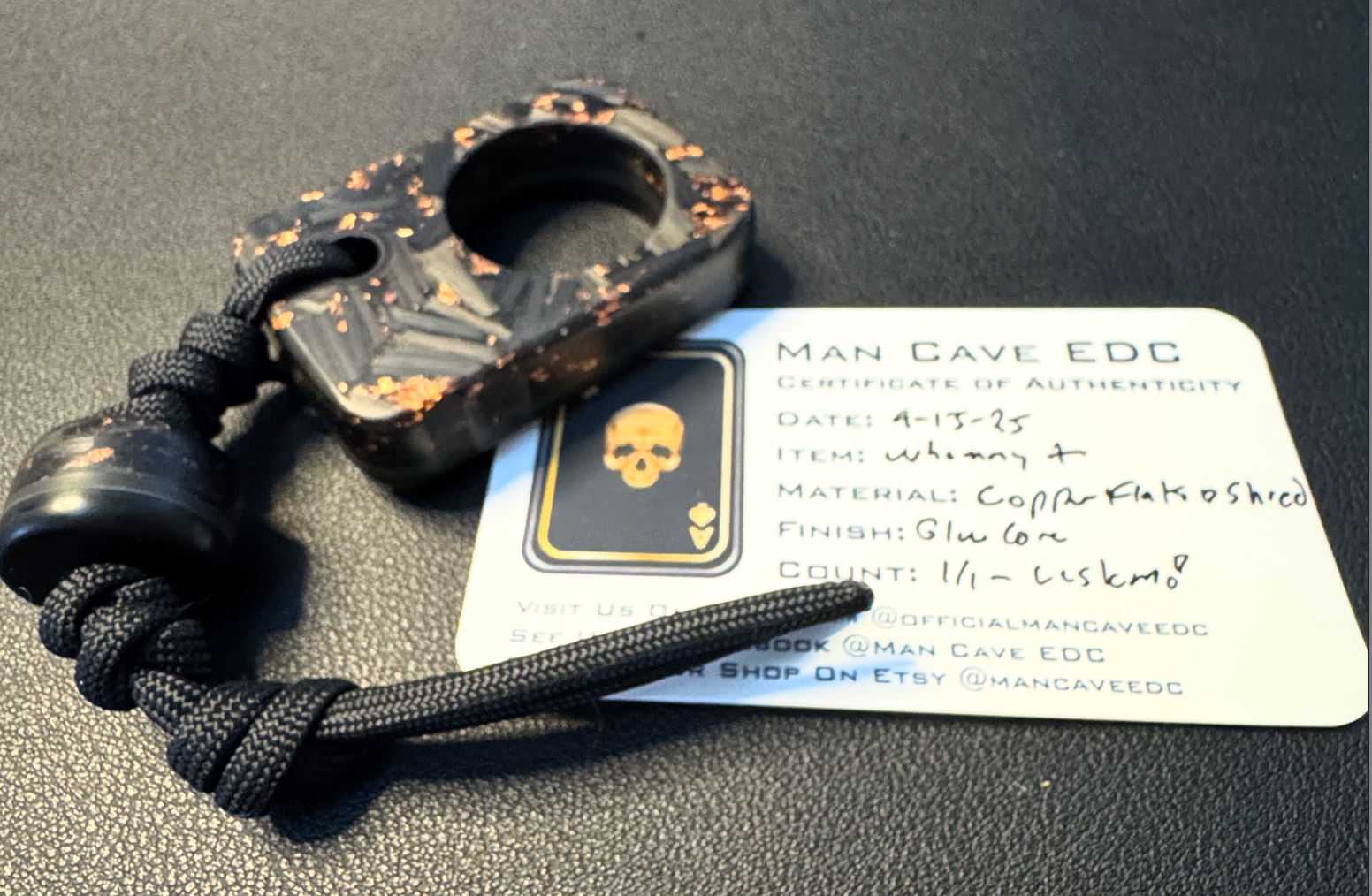 This is a Man Cave EDC Pocket Charm. It features Copper Flake Shred with a green glow layer inside. Back is made of black G10. It includes a matching bead made with the same materials. This item is a piece of art that includes a Certificate of Authenticity.